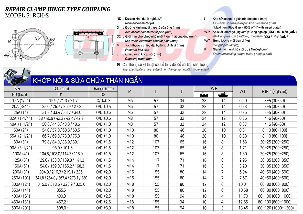 Khớp nối & sửa chữa đa năng: RCH-S chuyên dụng để nối các đường ống và sửa chữa đường ống. Đây là khớp nối có thể thay thế cho các cách nối ống thông thường khác như: hàn xì, hàn điện, keo dính, ghép ren.Khớp nối sửa chữa cấu tạo đặc biệt có thể mở dễ dàng để lắp đặt. Với khớp nối sửa chữa RCH-S mọi thao tác thi công đều nhanh chóng, tiết kiệm thời gian và nhân công. Khớp nối ống sửa chữa được làm bằng chất liệu 100% thép không gỉ (INOX 304/316L) có thể chịu nhiệt độ cao thích hợp với mọi loại môi trường và mọi loại ống ở Việt Nam, dễ dàng bảo trì và thay thế, giúp nâng cao tuổi thọ của hệ thống ống.